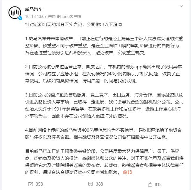 " 威马汽车并未申请破产!"10 月 18 日,威马汽车公开回应," 不存在公司创始人跑路海外的情况 "。