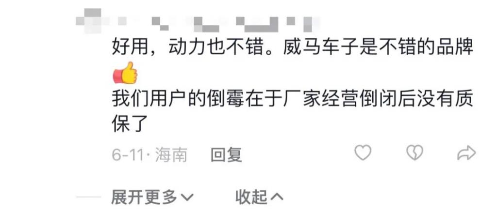 浮出水面的问题不仅是欠薪,网友发布视频表示,海南的威马车主曾于 6 月集合在一起维权。评论区有网友称," 我们用户的倒霉在于厂家经营倒闭后没有质保了。" 这似乎表明,威马汽车早在 6 月就出现了经营问题,用户本该享有的服务也基本无法提供。