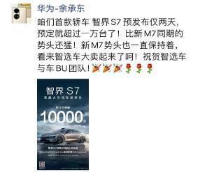 余承东发朋友圈:智界 S7 预定过万 比问界新 M7 还猛