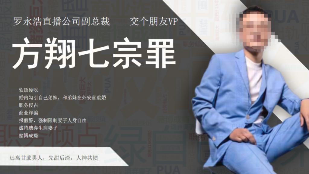 除了感情方面的指控,作者还罗列了方翔在工作方面的多项 " 罪状 "。比如,方翔在交个朋友担任 VP 期间,利用职务之便让自己的亲友和下属在外成立公司做交个朋友直播业务的合作,并将交个朋友的业务切到自己在外的公司收取更大的个人利益,方翔还利用职务之便在交个朋友内部帮助亲友公司推进业务、介绍关系。
