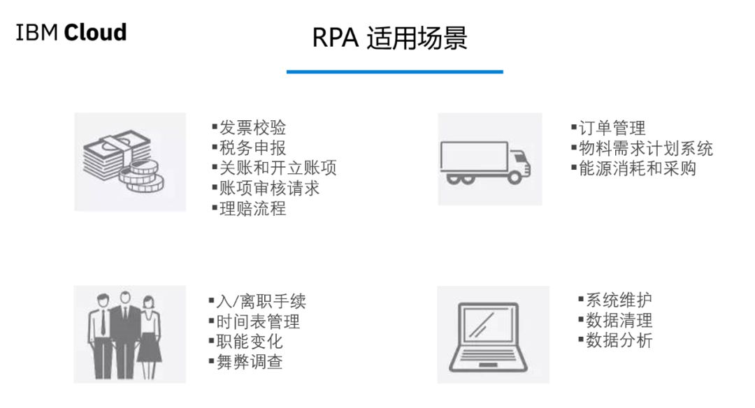 而IBM则认为,“在企业以实现人工智能(AI)转型为目标的同时,企业内部单一、重复、且繁琐的事务性工作却又在禁锢着员工的发展。RPA 把员工从这些工作中解放出来,优化整个企业基础流程作业、降低成本、提高效率、和确保零失误,是企业迈向人工智能的第一步。”