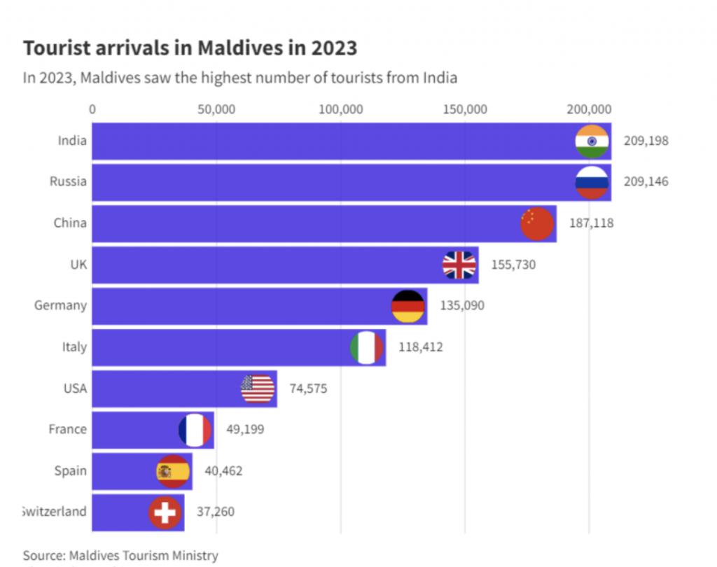 作为马尔代夫最大游客来源国,印度人选择大量退票。同时,印度最大的旅游平台 EaseMyTrip 已暂停飞往马尔代夫的所有航班预订。印度最大的旅游公司之一 STIC Travel Group,鼓励旅行社和航空公司不要前往马尔代夫旅游。印度最大的贸易机构之一,全印度贸易商联合会也呼吁其成员暂停与马尔代夫的业务。
