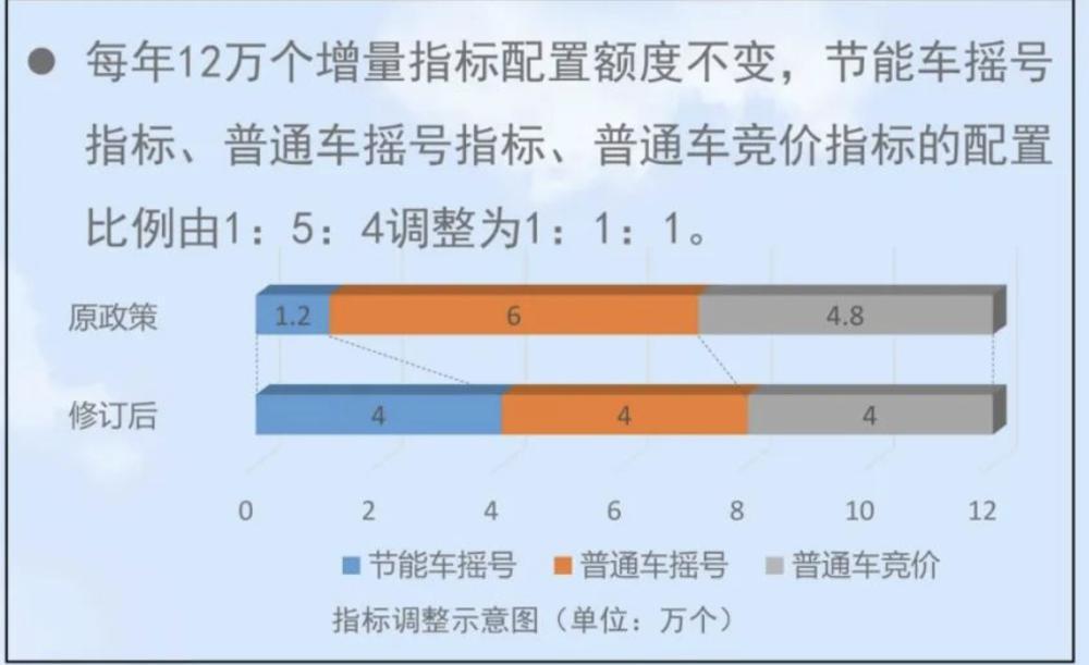 记者了解到,《办法》修订征求意见稿提高增量指标摇号配置额度,并向节能车指标倾斜。摇号配置额度由 7.2 万个提高至 8 万个,竞价配置额度由 4.8 万个降低至 4 万个。同时,为促进车辆节能减排,引导市民购买节能环保车型,增加节能车增量指标配置额度,由每年 1.2 万个增加至每年 4 万个,节能车摇号指标、普通车摇号指标、普通车竞价指标的配置比例由 1:5:4 调整为 1:1:1。