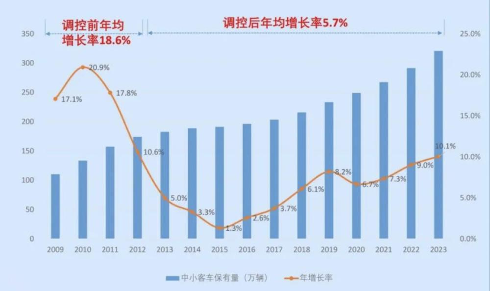 广州市自 2012 年 7 月起实施中小客车指标调控政策以来(截至 2023 年 12 月),广州市中小客车指标调控管理办公室累计配置各类指标约 462.6 万个,中小客车保有量由 2012 年 6 月底的 169.4 万辆增长至 2023 年 12 月底的 320.8 万辆,年均增长约 13.2 万辆,年均增长率由调控前的 18.6% 下降至调控后的 5.7%,中小客车保有量迅猛增长的势头得到有效遏制。