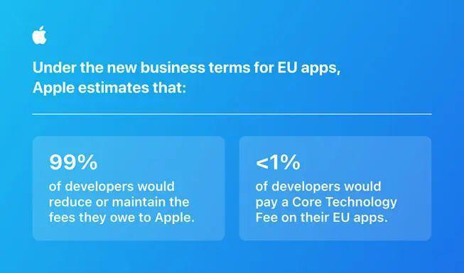 苹果甚至放下豪言,会有 99% 开发者会因为新优惠收益,少于 1% 选择支付核心技术费的方案。