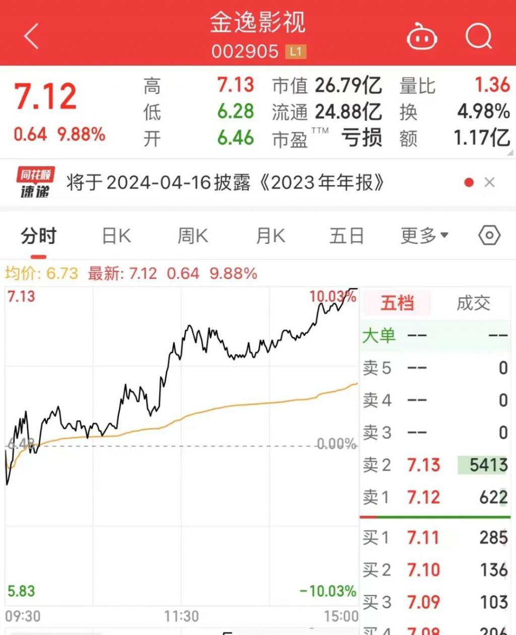 截至春节前(2 月 8 日)A 股收盘,金逸影视(SZ002905)股价 7.12 元,市值 26.79 亿元。