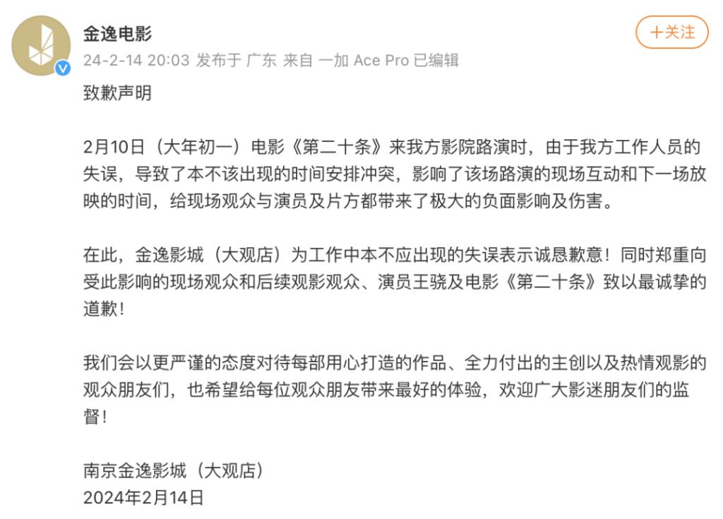 2 月 10 日(大年初一)电影《第二十条》来我方影院路演时,由于我方工作人员的失误,导致了本不该出现的时间安排冲突,影响了该场路演的现场互动和下一场放映的时间,给现场观众与演员及片方都带来了极大的负面影响及伤害。