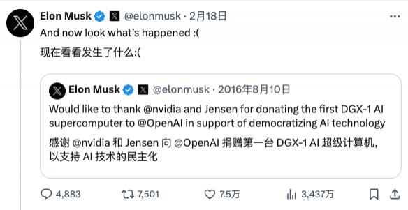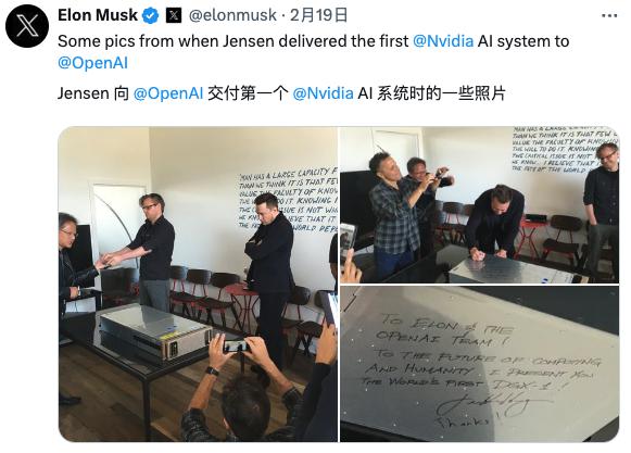 他直接 po 了张照片,照片上是当年马斯克带着老黄,给 OpenAI 签名捐赠首台 DGX-1AI 系统的场景。