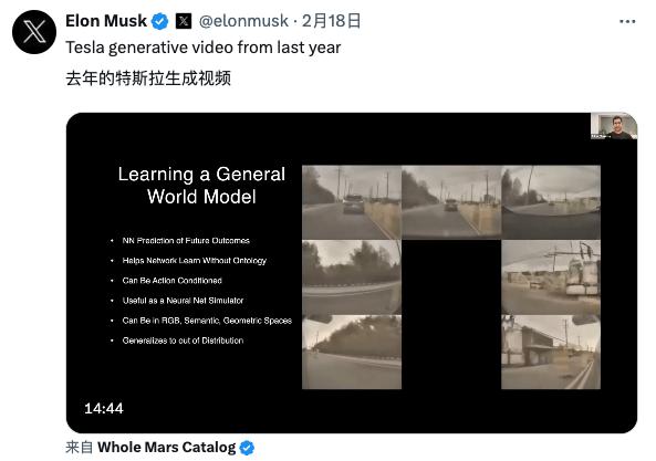 就拿国际一线吃瓜仔马斯克来说, Sora 刚发布他就贴脸开大,咱家特斯拉去年就有很好的视频生成了。