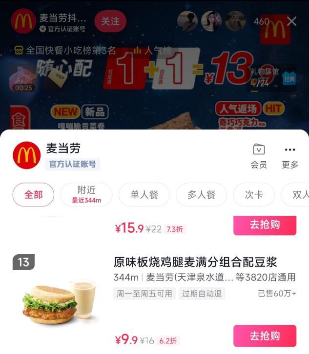 比如,麦当劳抖音直播间里,原味板烧鸡腿堡配豆浆,售价 9.9 元,销量超过 60 万;饱受诟病的麦旋风,也在麦当劳 App 上,推出了 10 元两份的优惠。