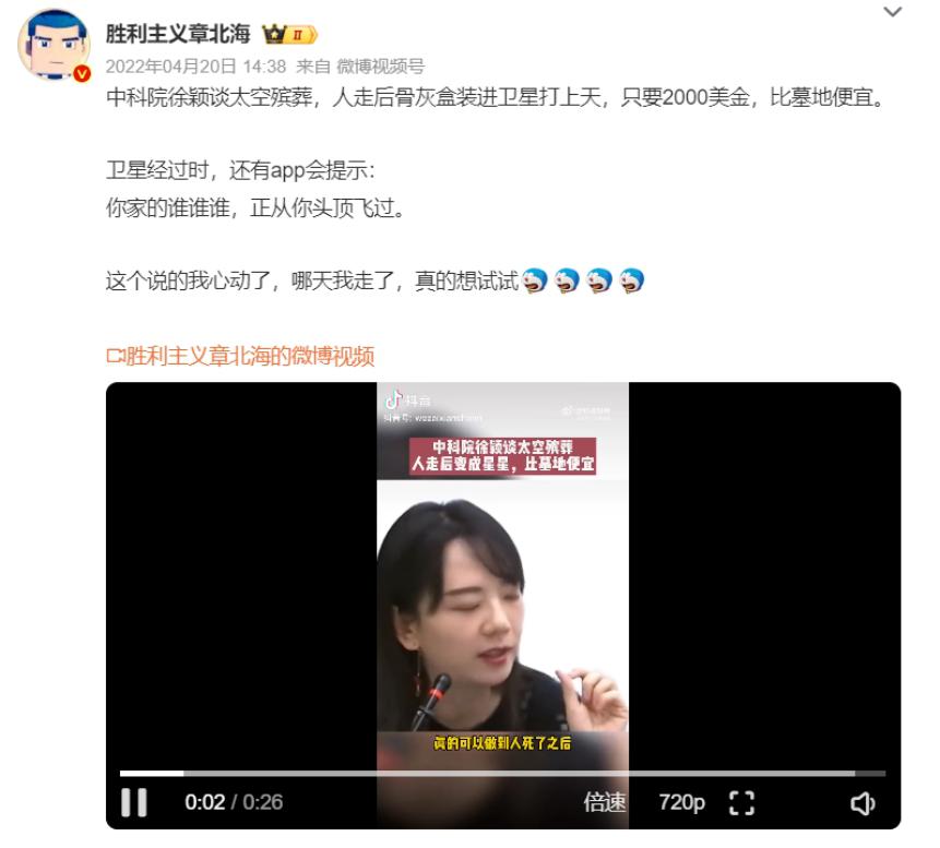 值得一提的是,市场上前些年就已经有了太空殡葬的概念,比树葬等更 " 前卫 "。