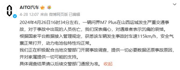 4 月 28 日,问界声明称,该车辆发生事故时车速 115km/h,安全气囊正常打开,动力电池包特性均正常。目前,事故原因有待有关方面进一步调查。