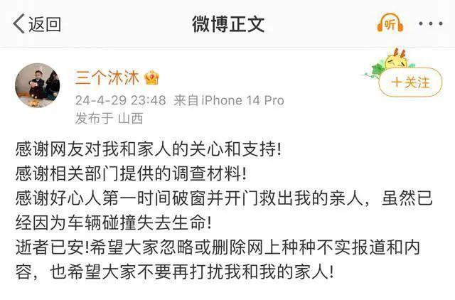 4 月 29 日,事故家属发布最新声明称," 感谢好心人第一时间破窗并开门救出我的亲人,虽然已经因为车辆碰撞失去生命,逝者已安,希望大家忽略或删除网上种种不实报道和内容,也希望大家不要再打扰我和我的家人。"