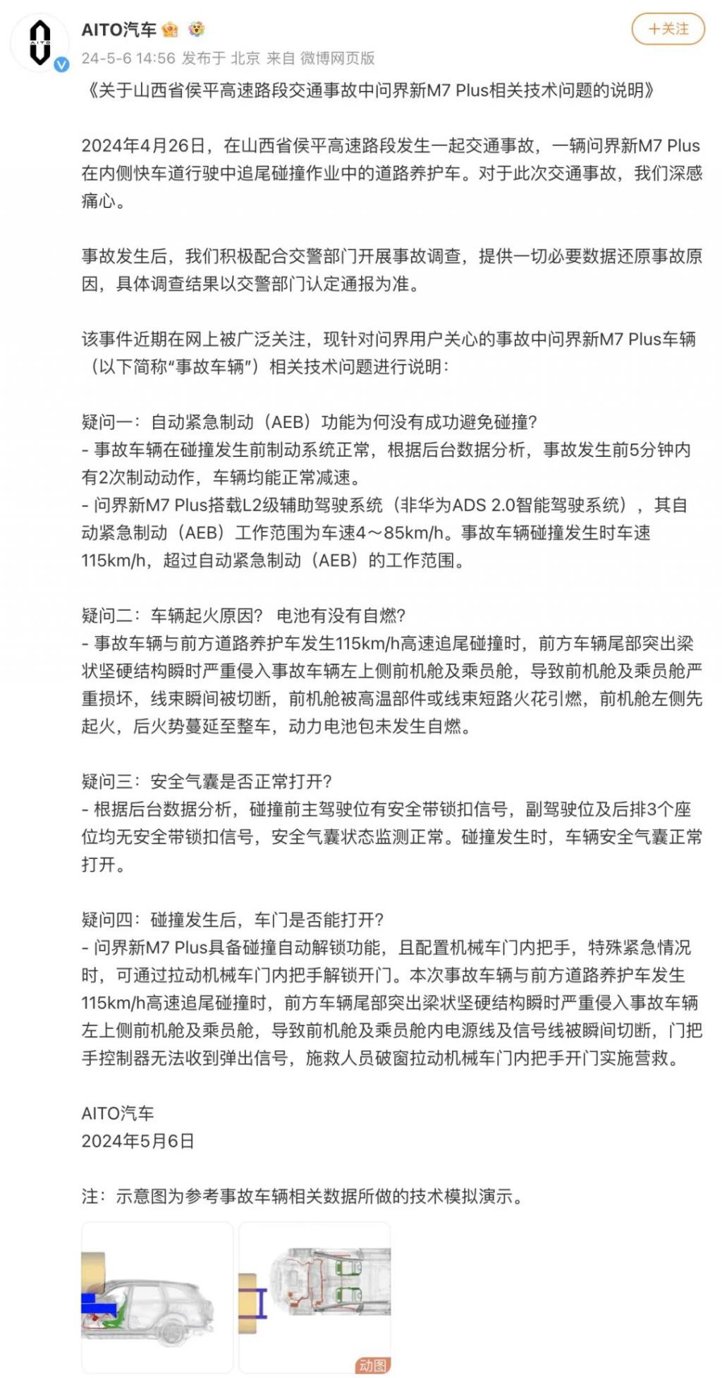 5 月 6 日下午, AITO 汽车官方微博发布《关于山西省侯平高速路段交通事故中问界新 M7 Plus 相关技术问题的说明》,首次披露其官方调查的结果。详情如下: