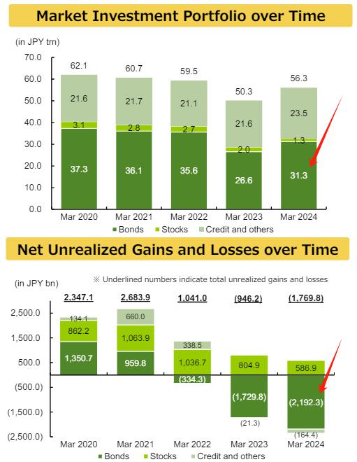 根据农林中金上个月公布的文件,截至今年 3 月份,该行 31.3 万亿日元的债券持有量约占其整体投资组合的 56%,这一部分的未实现亏损达到了 2.19 万亿日元。