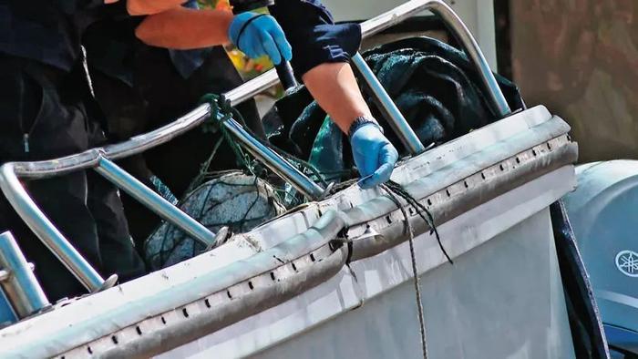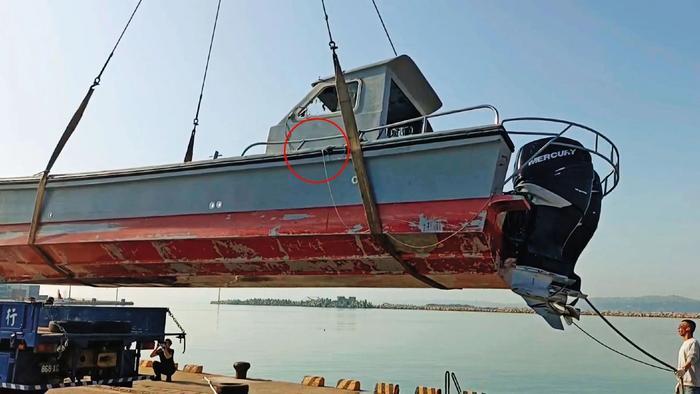 已打捞上岸的大陆渔船照片显示,其左后舷处有明显凹痕 图片来源:《镜周刊》