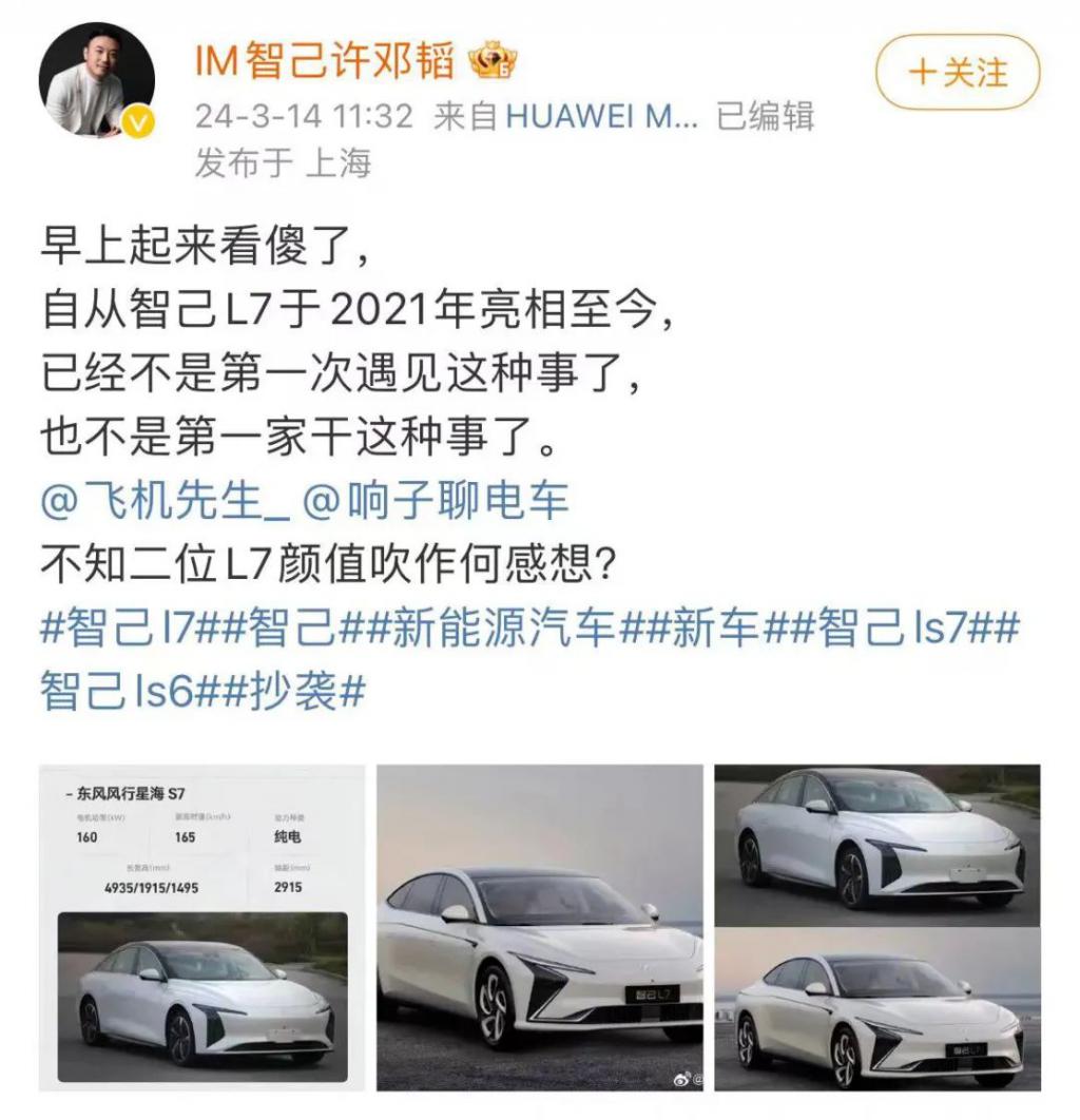 此前,智己汽车设计总监许邓韬就在个人社交账号上发文," 怼了 " 一下东风风行星海 S7 的设计。从图中可以看出,从许邓韬发布的同角度对比图来看,两辆车的大灯组造型确实有几分类似,都采用了细长 LED 灯带 + 大面积熏黑的设计。