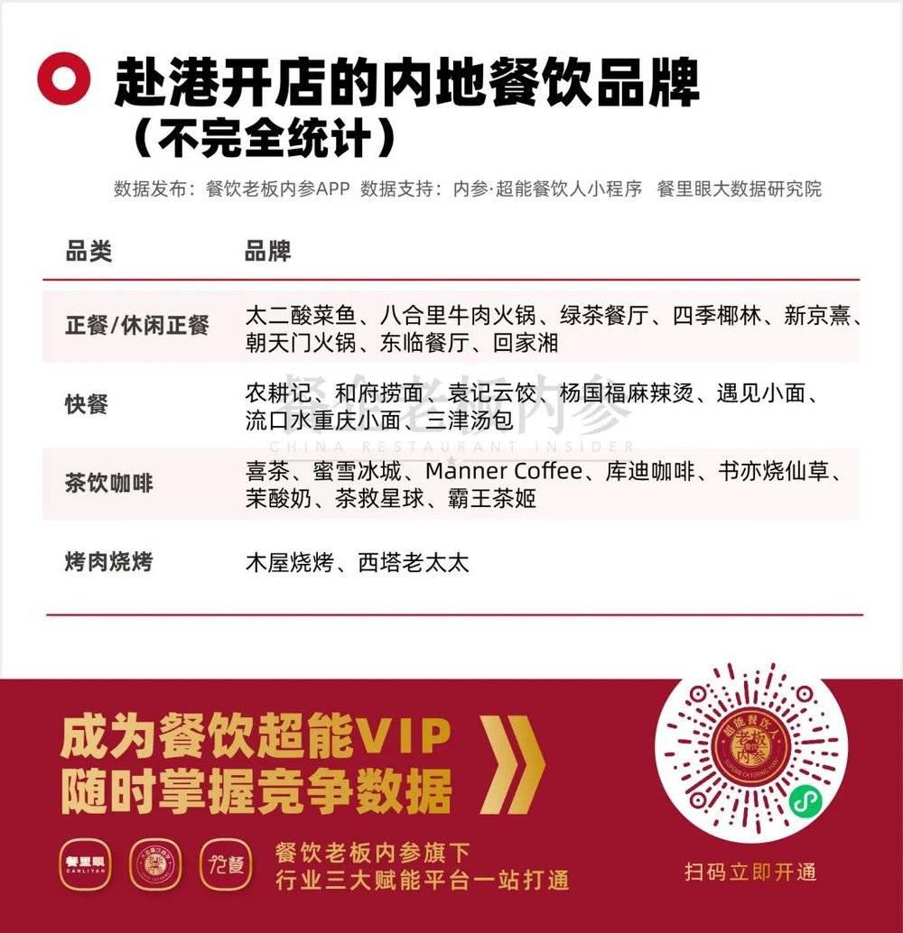 餐饮老板内参不完全统计,至 2024 年 7 月,在香港开店及已经立出餐饮围挡的内地餐饮品牌已超过 20 家,其中既有精致餐饮,也有小吃快餐。
