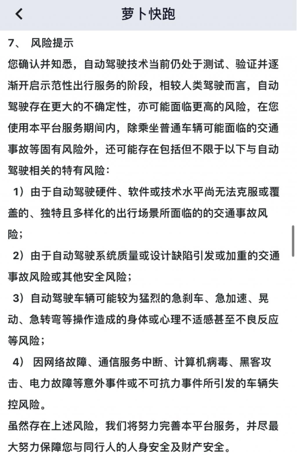 " 萝卜快跑 " 平台服务协议显示,目前乘客乘坐无人 / 自动驾驶汽车存在交通事故、不良反应、车辆失控等多种风险。值得注意的是,平台暂未披露针对车辆和乘客投保了哪些保险。也有专家表示,现有无人驾驶车辆的投保方案存在一定的保障缺口。