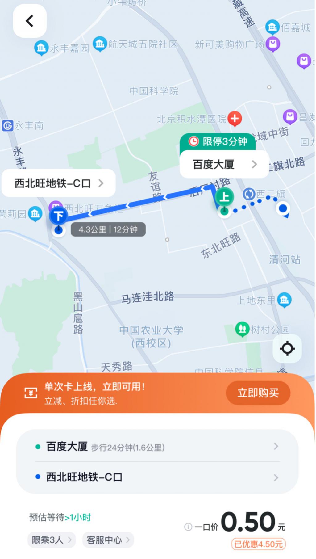 钛媒体 APP 在北京体验 " 萝卜快跑 "APP,平台显示,一段运营区内 4.3 公里的行程,原价为 5 元,活动优惠后只需要 0.5 元,价格相较于传统网约车平台价格优势明显。