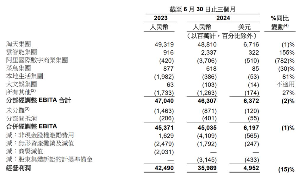 此外,本地生活的收入同比增长 12%,主要来自饿了么与高德订单贡献;与此同时,减亏明显,经调整 EBITA 从去年同期的亏损 19.8 亿元收缩至亏损 3.9 亿元。