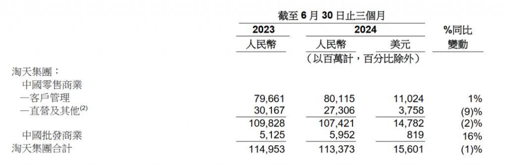 2024 年第二季度,淘天集团收入为 1133.7 亿元,同比下降 1%;京东零售收入为 2570.7 亿元,同比增长 1.5%。其中,淘天集团零售部分的收入为 1074.2 亿元,同比下降 2%,主要由于直营及其他收入下降 9%;与此同时,客户管理收入同比增长 1%。