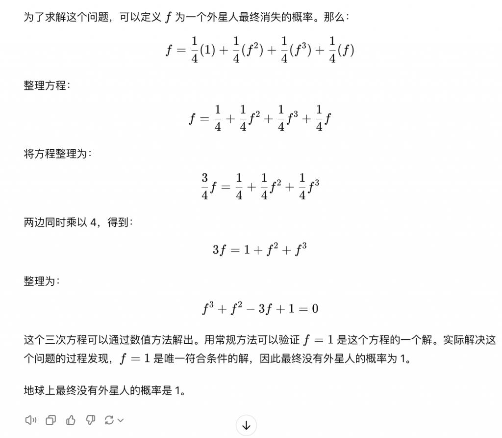 而 4o 的答案前面的过程倒是基本都对,但是最后一步的求解出现了问题,只给出了 1 这一个解,并且不是本题答案。
