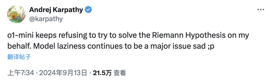 比如前特斯拉自动驾驶负责人、两度进入 OpenAI 又两度离职的大神 Andrej Karpathy 发现,o1-mini 在被要求证明黎曼猜想的时候出现了拒绝回答的情况,表示大模型 " 犯懒 " 依然是一个大问题。