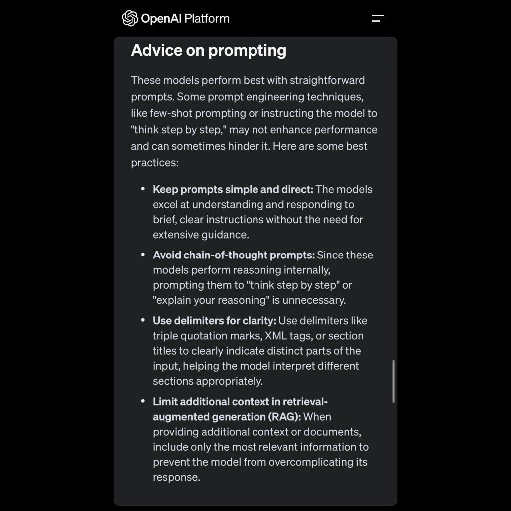 由于 o1 在内部采用了一些类思维链过程,因此 prompt 的设计和普通版本也有所区别,OpenAI 官方发布了一则提示: