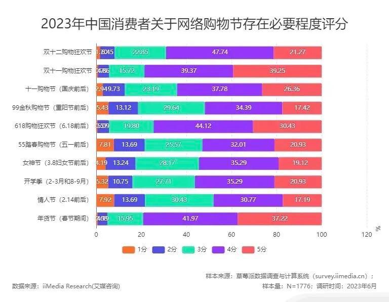 根据艾媒咨询近期的调研数据,消费者在对 618、双 11、年货节三大购物节日存在的必要程度评分 ( 满分 5 分 ) 中,打出 4 分及以上的人数分别占到 74.55%、78.62% 和 79.19%,并且有 44.61% 的消费者认为 618 购物节活动的折扣最大。