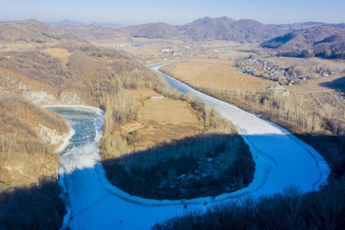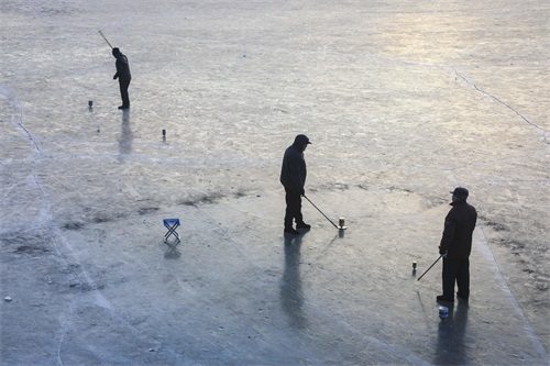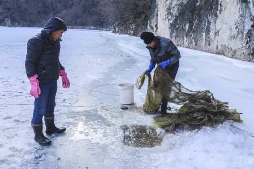 我们来到红土崖河,考察这条河流的旅游价值。河上已经结冰,但是当地的乡亲们不畏严寒,在冰面上破冰捕鱼。我们走在河面上,不时脚下的冰面有撕裂的轰响声,我们行走其上,格外小心谨慎。