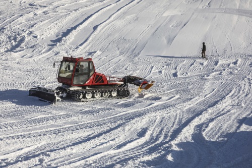 映入我们眼帘的滑雪场银装素裹,雪景美如画,车辆正在平整雪地。