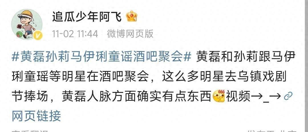黄磊带着明星好友在酒吧聚会引发网友热议,这次聚会是在黄磊和孙莉捧场完乌镇戏剧节后举行的。黄磊组织聚会游刃有余,尽显主人风范,孙莉也学到了不少“人情世故”,在聚会中表现得非常放松大方。童瑶和马伊琍也被狗仔拍到,童瑶放松自在的样子让人惊艳,而马伊琍活得越来越年轻,完全没有明星架子,充满活力。狗仔感慨黄磊的人脉真是好,能聚集这么多明星大咖。黄磊的影响力无疑是巨大的。