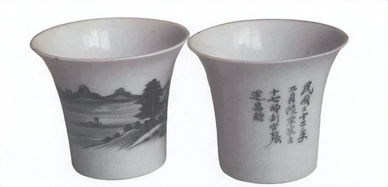 在民间收藏家朱先生的个人收藏中,有一对珍贵的白瓷杯,它们侈口柱身,釉色白净。杯身的一面是一幅水墨画,有青山空谷、绿林幽居,看似透露着浅斟低唱般的雅致旖旎,但杯身另一面题写的几行厚重有力的毛笔字——“民国二十二年二月陆军第三十七师副官张运昌赠”,使它们看起来不仅古雅温润,更多了一分苍凉和悲壮。