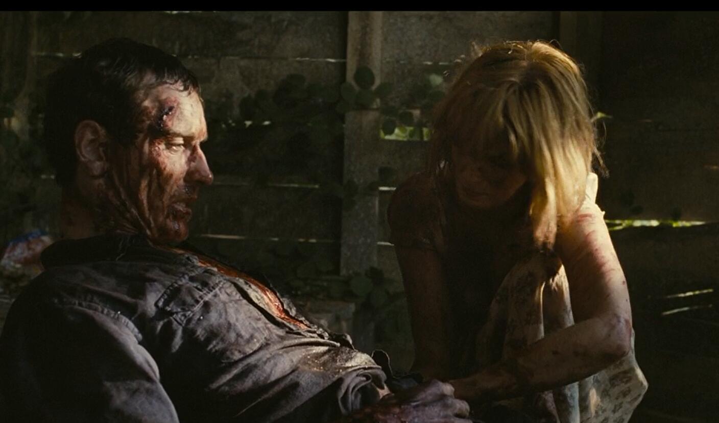 那群未成年追踪到小木屋,发现一淌血,而此时的夫妇躲在木屋的水下,差点被发现。由于男主受了很严重的伤,加上被这些孩子一刀一刀割,意识开始模糊。女主为了救他,跑出路上求援。但是又遇到那些孩子,在逃的过程又遭遇了尖刀一样的铁钉扎伤了脚。