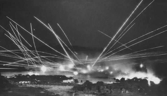 在第二次急袭的时候天都黑了,解放军的密集炮火生生照亮了金门岛的上空,一颗颗炮弹自福建前线发射拖着长长的尾巴,以抛物线的形式落在金门岛上,落地爆炸的瞬间照亮了夜空。