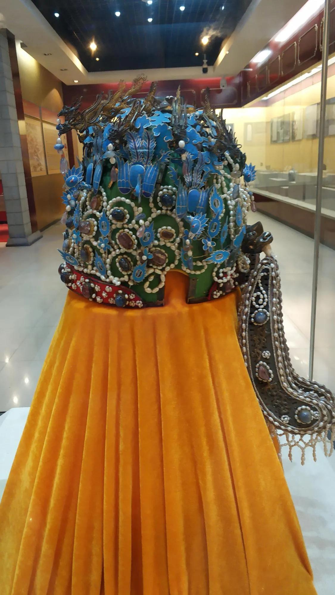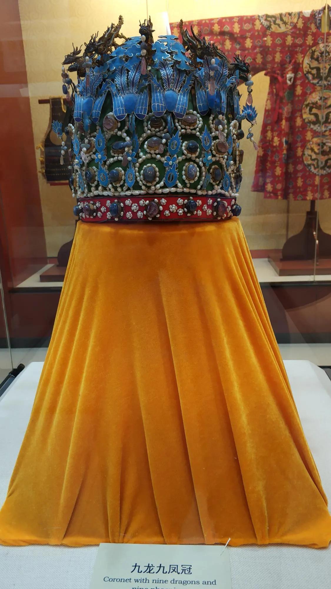 皇后凤冠有三龙两凤冠、六龙三凤冠、九龙九凤冠、十二龙九凤冠。其中六龙三凤冠上六条龙均由金丝编织而成,栩栩如生,三只用翠鸟羽毛粘贴的凤居下,仿佛要破空而起。龙、凤口衔珠宝,在由珍珠宝石缀编的牡丹花、如意云、花树之间穿行。凤冠后的六扇博鬓左右分开,珠光宝气,极其奢华,其上共装饰红、蓝宝石128块,各种珍珠多达5400余颗。