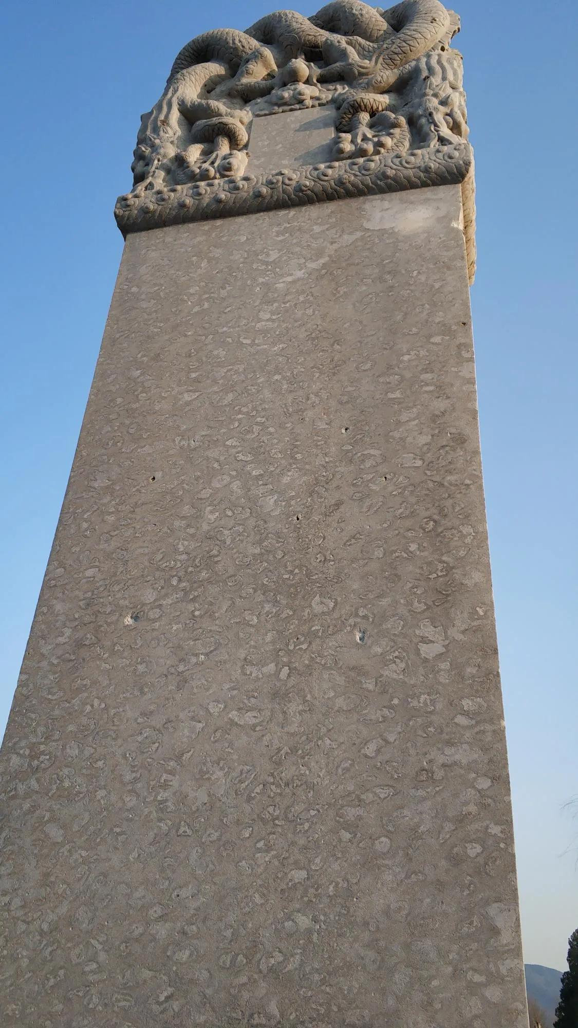 过了三座桥直抵陵园门口处的无字碑。无字碑体积巨大,螭首龟趺,因其迥异于常见石碑,通身光洁不留一字而得名,也成为后人心中的谜。寓意可能是千秋功过让后人评说吧。