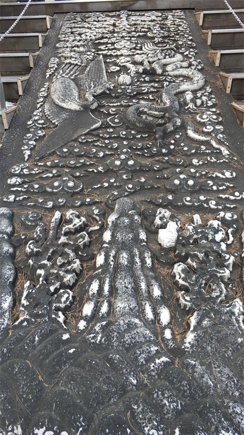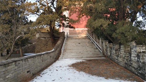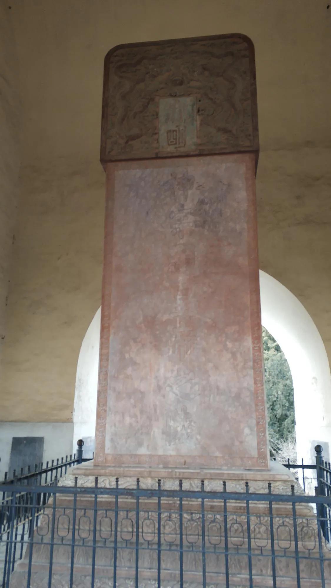 接着前行就到了明楼,明楼壁前、后、左、右四面各辟券门,楼内树立圣号碑一通,高6米多,碑首为方形,前后刻双龙戏珠图案,碑趺采用上小下大五级方台式,其上面四级自上而下,分别雕刻双龙戏珠、云、宝山、海浪等图案。