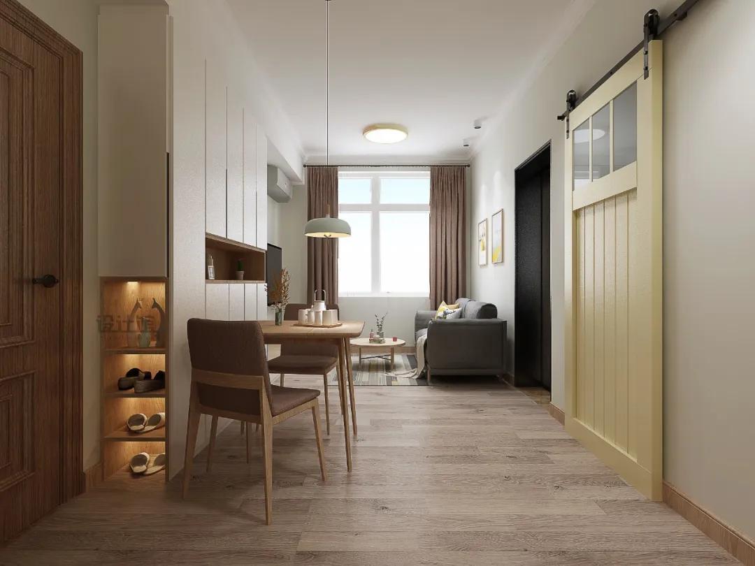 电视墙的左侧开了一扇门。如果安装普通门,则整个电视墙看起来会很小且笨拙。通过在右侧制作屏风,然后在左侧做门的设计,使整个外观更加美观大方。