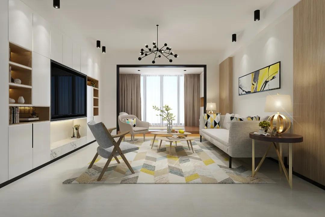 对称是设计中的常见技术。它可以通过隐形门的对称设计,背景墙的两侧趋于对称,形成一个整体,使空间更加完整。