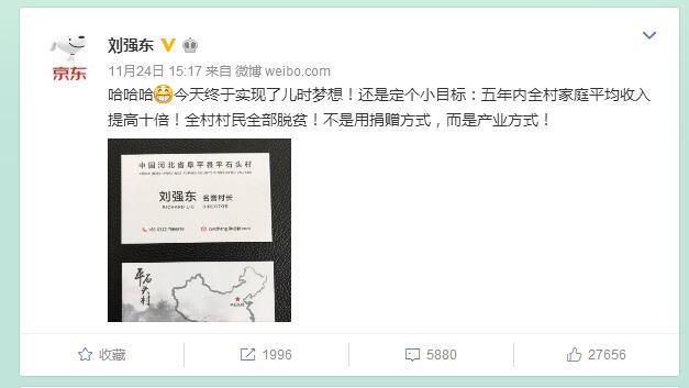 刘强东微博宣布上任为村长