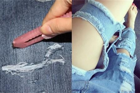 是不是觉得很简单呢,以后就不用去商城买破洞牛仔裤了,自己动手做,破洞的大小及位置都可以有自己定,这样就会更加有独特的个性了。赶快把自己那些不像穿的牛仔裤拿出来试试吧,加上几个破洞,一条新的牛仔裤就出来了。