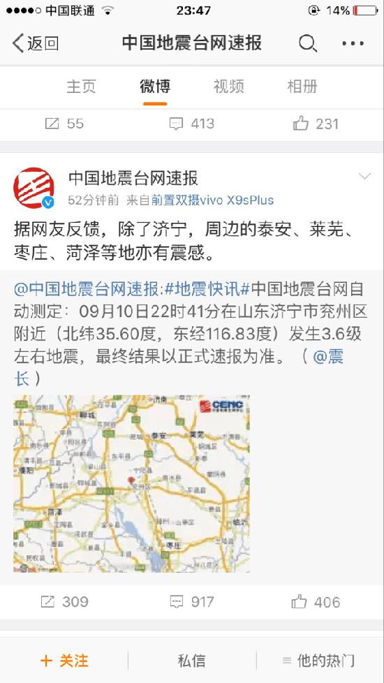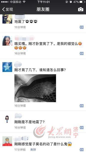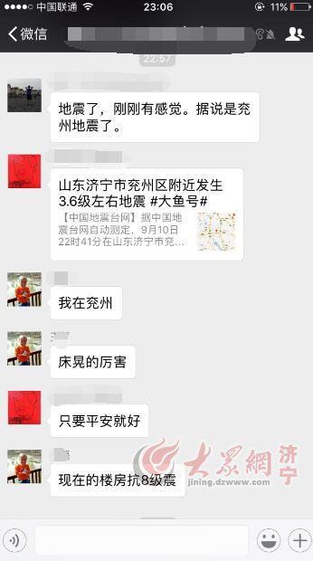 大众网济宁9月10日讯(记者 李丹)10日晚10点40分左右,济宁网友的朋友圈被“济宁发生地震了”的信息刷屏。兖州、邹城等几个县市区的市民表示震感明显。
