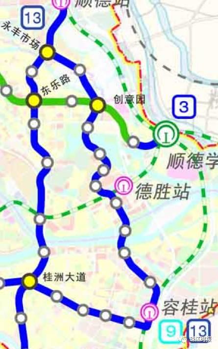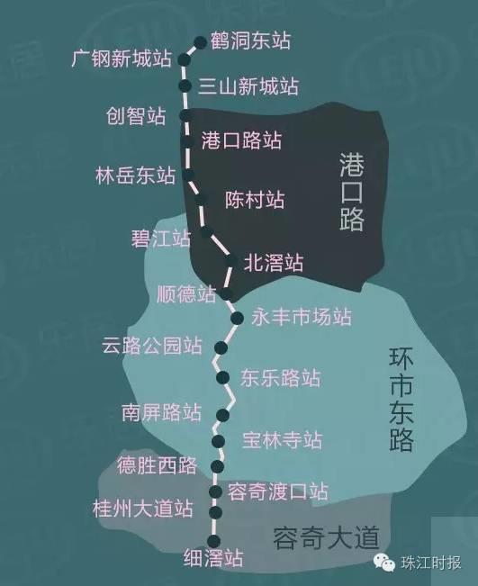 顺德区域内将经过陈村、北滘到伦教、大良、容桂,经过南海的三山新城,与4号线换乘。线路长约 41km,设车站20座。