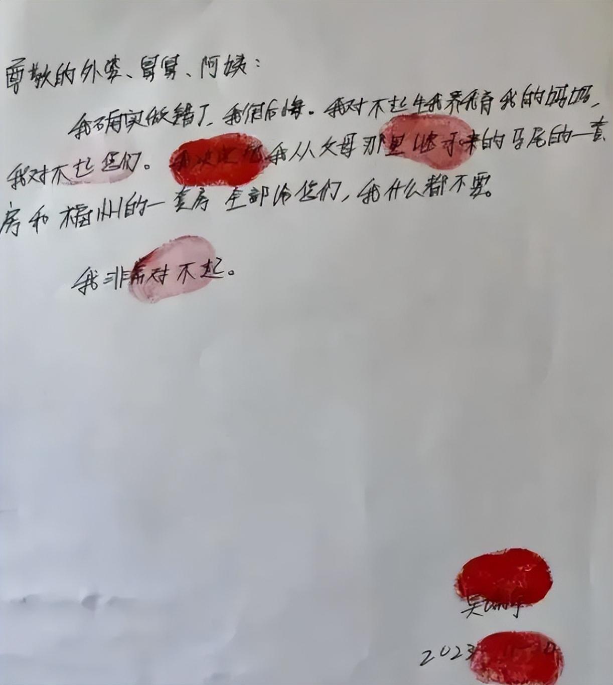 他在到道歉信中表示:“敬爱的外婆、舅舅、阿姨,我深知自己的错误,对此我极为后悔,我愧对生育养育我的母亲,也愧对你们。为了表达歉意,我决定将从父母那里继承的马尾区一套房产以及福州的一套房产全部赠予你们,我自身别无所求;期望以活命的方式去弥补罪行,寻求救赎之道。”