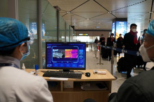 哈尔滨太平国际机场进港处利用红外测温仪测温
