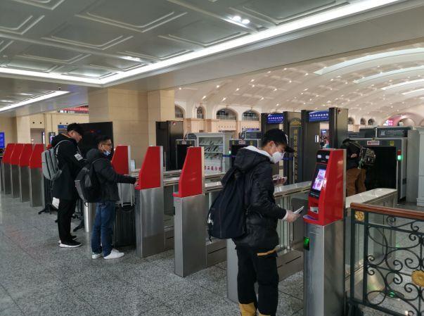 哈尔滨火车站旅客进行人脸识别或是刷身份证检票进站