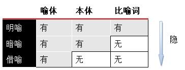 (注:在暗喻中,通常认为“是”、“成为”、“形成”等谓语成分充当了比喻词。如果我们狭义地理解比喻词,则暗喻也可以视为没有比喻词,这样就可以填充上边的表格,能更清晰地看出三种比喻形态之间的逻辑关系。)