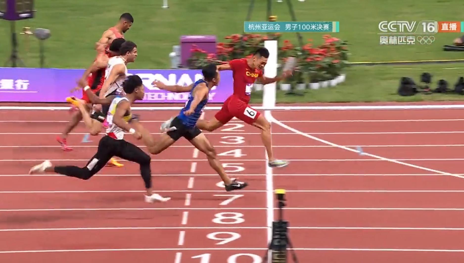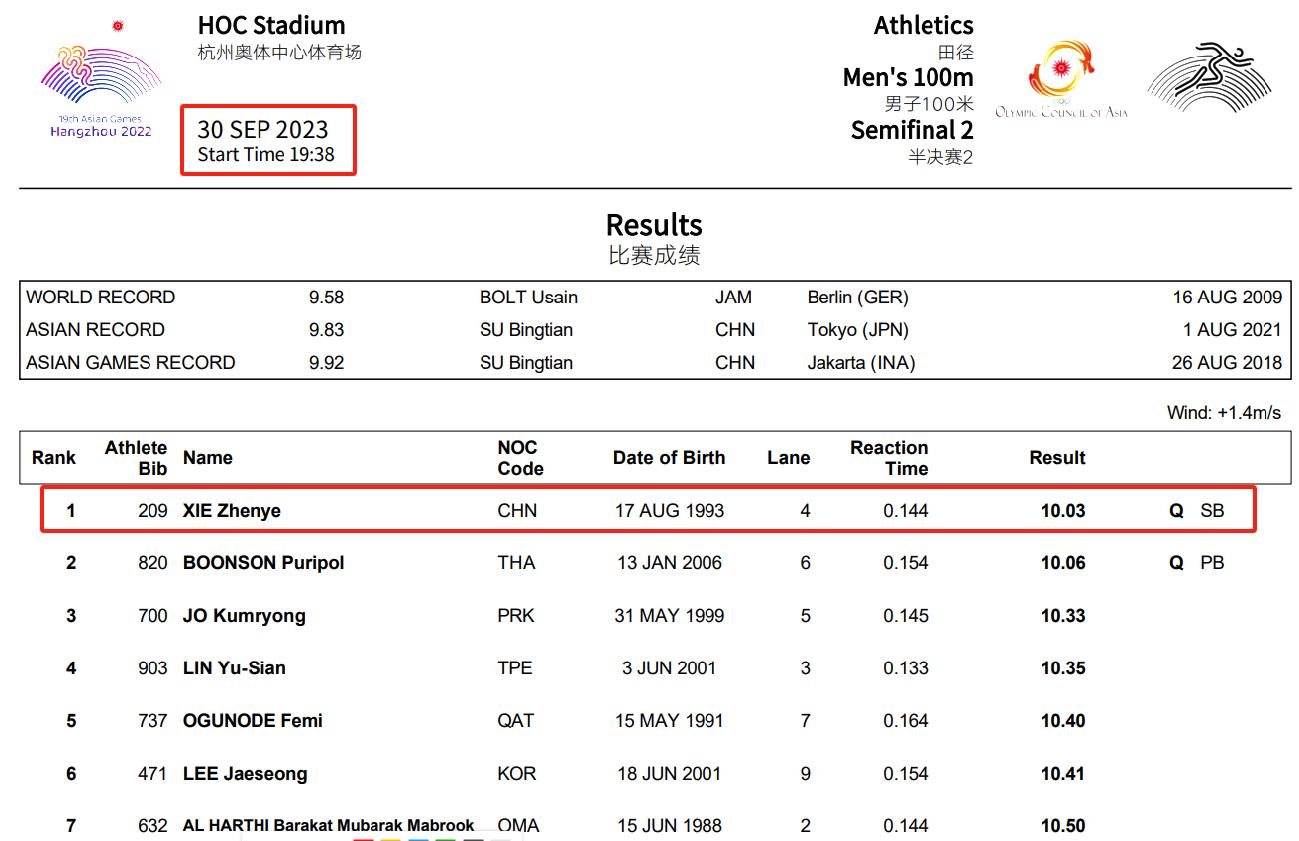 杭州亚运:2023年9月30日19:38 谢震业10.03SB小组第1 风速+1.4 反应时0.144